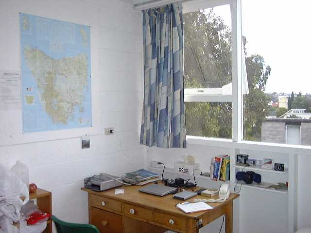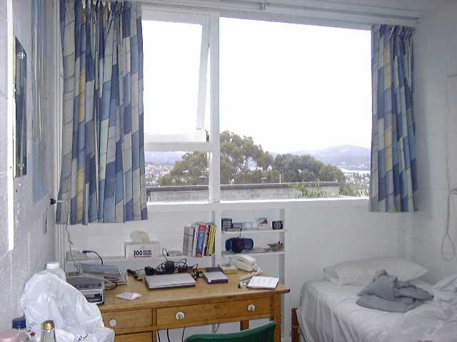 タスマニアではタスマニア大学の学生寮の一つ Christ College に住んでいました. 6畳くらいの一人部屋はけっこう有意義に暮らせる部屋でした. 窓からは遠くに海・・・ではなく河口を見ることができます.